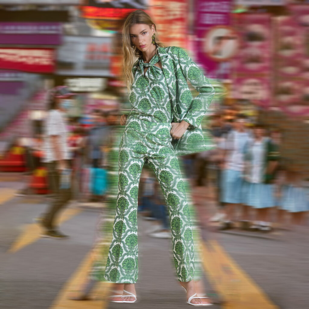 Il verde è il colore che meglio rappresenta la vita. E’ anche il colore della frutta, come l’avocado che non solo è uno tra i cibi in voga del momento, ma si conferma anche nella palette della stagione primavera/estate 23. Questo completo in pizzo valorizza la silhouette femminile con eleganza e le pumps glitterate in oro rosa, donano al look un’allure glamour. Il secchiello in rattan è l’accessorio che non può mancare per completare l’outfit e rendere il tutto “outdoor”.