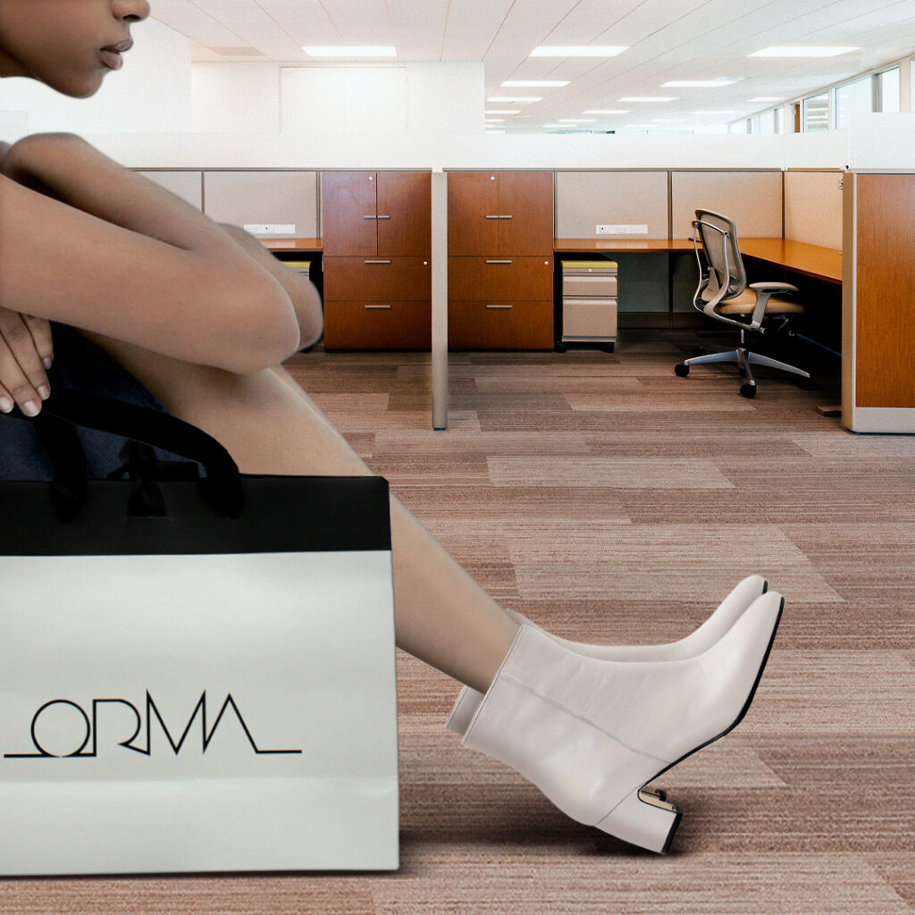 Questo look è il giusto compromesso tra comodità ed eleganza. L’abito lettering all over in maglia, caldo e stretch, ideale per esaltare le curve e avvolgerci, unito allo stivale pump in testa di moro, super versatile, senza dimenticare la borsa tracolla padded in laminato arancione, un raggio di sole per irradiare le giornate grigie. Risultato? Un look da ufficio impeccabile con stile.
