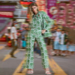 Nel modello di tessuto, completato con un polo a body, cappotto a piumino e stivaletti con coulisse è urban chic. Nel colore cuoio, unito a rain jacket in nylon lucido e décollété punk è da vera trendsetter.