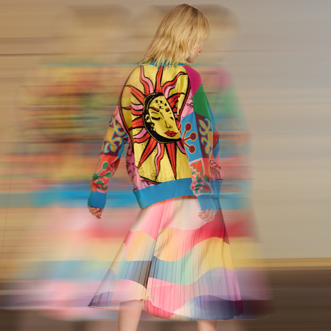 Bomber in cotone con pattern knit “moon and sun”, unito all’abito plissé effetto optical, un gioco di colori che ci nutre di vitalità. I sandali lace up in satin, sono il tocco da vera trendsetter.